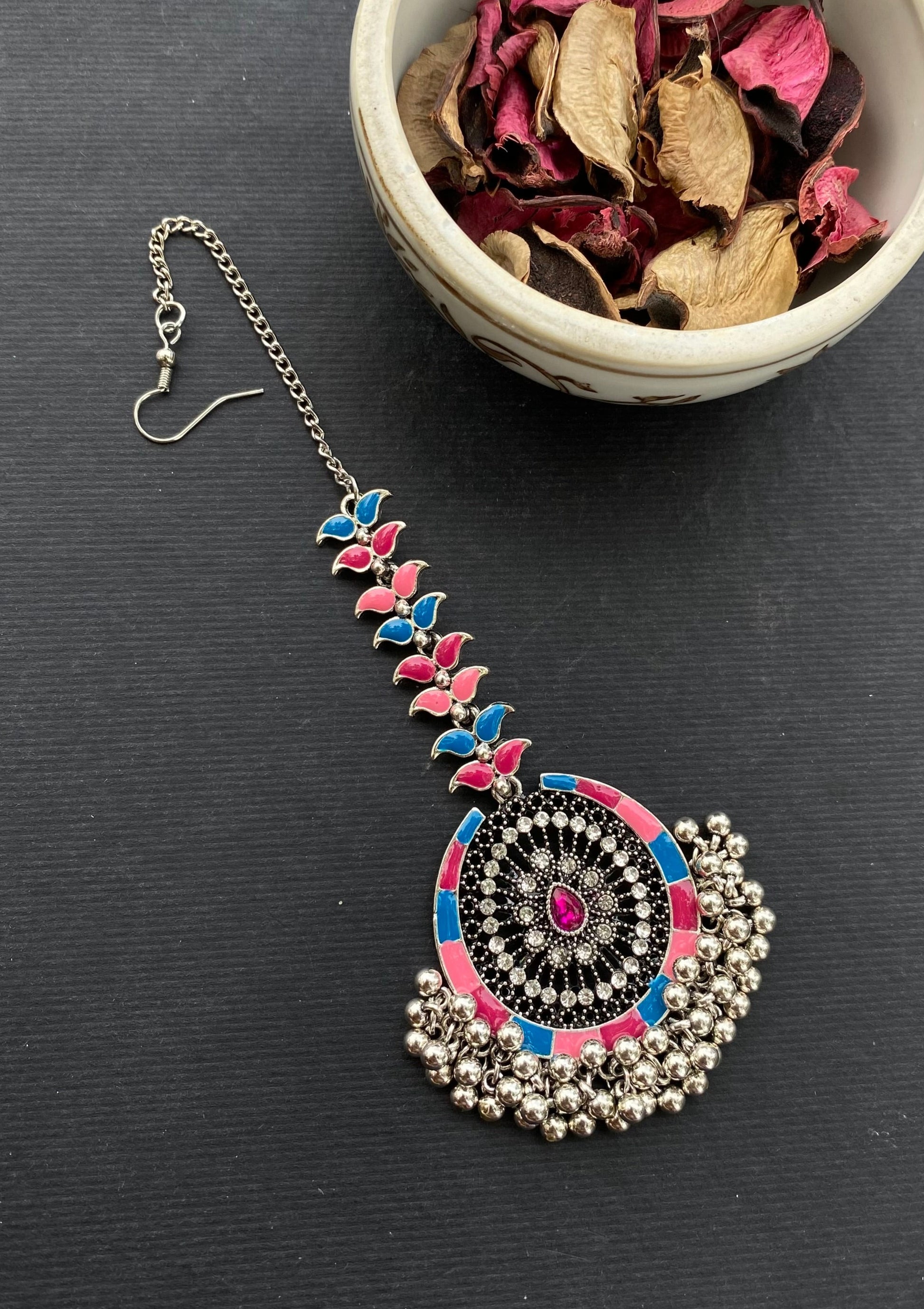 Antique Light weight pink & blue tikka with hanging gungroo beads.
