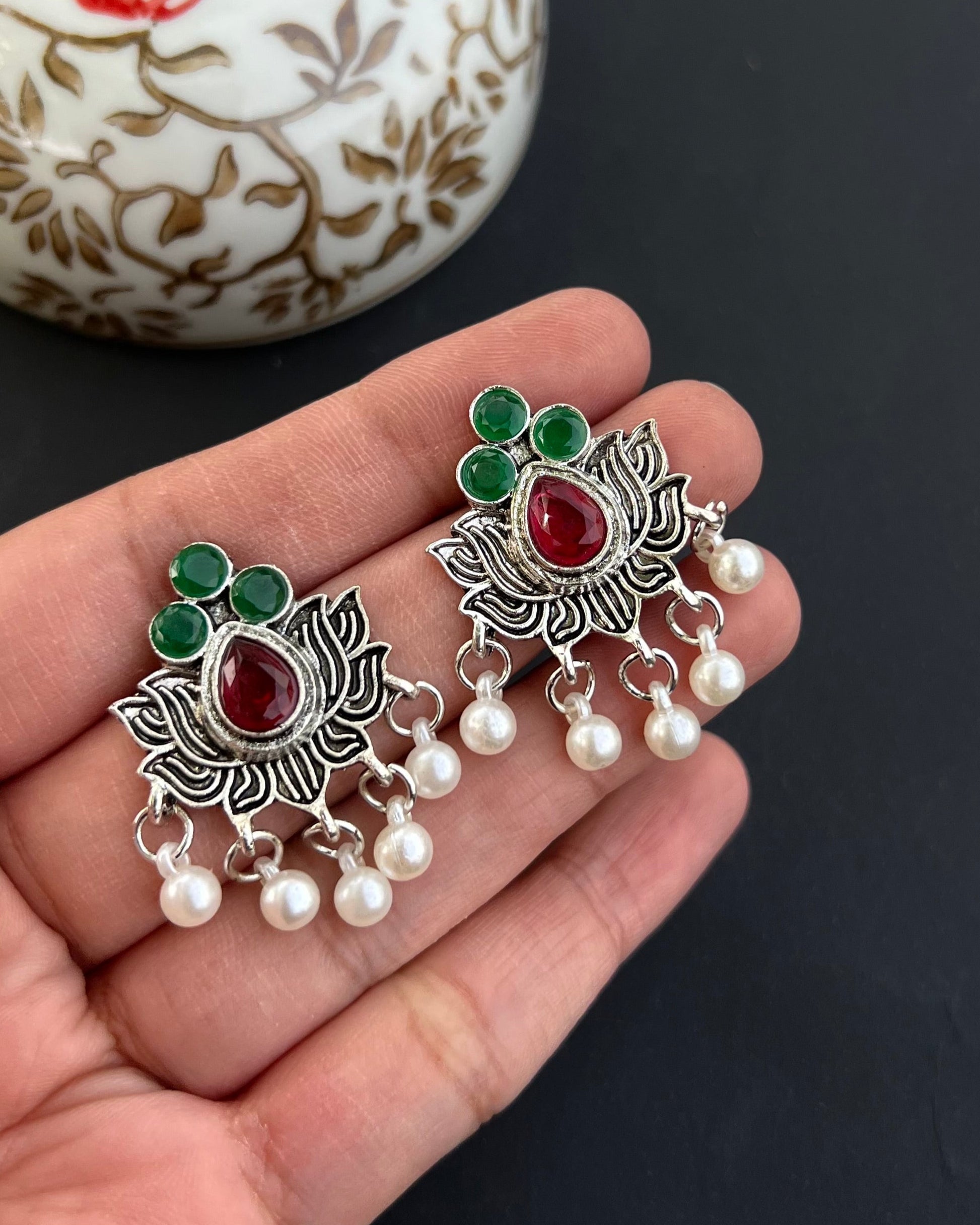 Oxidise lotus stone earrings with hanging pearl beads.